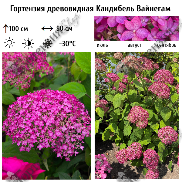 Гортензия древовидная Candybelle® Вайнегам - красивый кустарник с крепкими стеблями и  компактной кроной, высотой до 100 см   и в ширину до 90 см. У Кандибель Вайнегам крупные  шаровидные соцветия с простыми цветками, от светло-розового до потрясающего пурпурного окраса. Цветение с июля по сентябрь. Candybelle® Winegum хорошо растёт на солнце и во влажной, хорошо дренированной почве. Благодаря компактной форме она не требует особого ухода, но после периода цветения можно провести лёгкую обрезку.