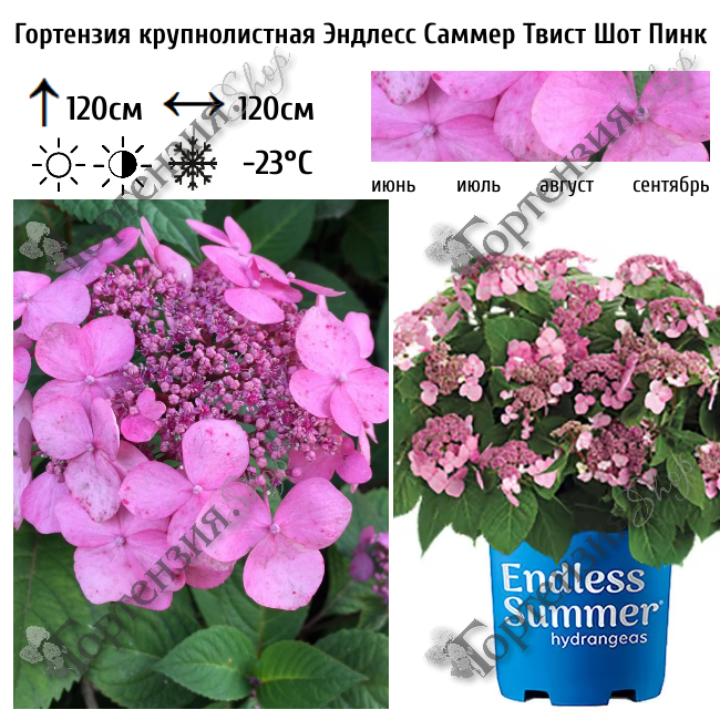 Гортензия крупнолистная Эндлес Саммер Твист Шот Пинк  цветущий кустарник высотой и шириной до 1,2 м.  Листва глянцевая тёмно-зелёная, осенью красно-бордовая. Побеги красные. Цветёт обильно всё лето на прошлогодних побегах и побегах текущего года.  Ажурные соцветия состоят из плодоносящих мелких цветков (в центре) и стерильных, более крупных  цветков. Соцветия диаметром до 15 см., в  зависимости от кислотности почвы могут быть розовыми или голубыми. Цветение с июня по август. Подходит для одиночных и групповых посадок а также для выращивания в контейнере.  На зиму требуется укрытие.