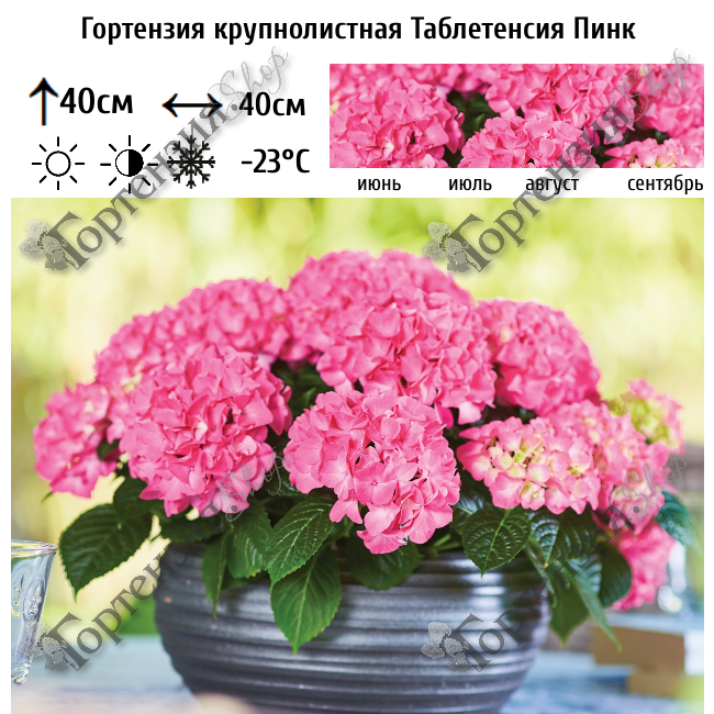Гортензия крупнолистная «Таблетенсия пинк» (Hydrangea macrophyllа «Tabletensia Pink»)  высотой 30- 40 см. Единственная в своем роде гортензия — низкорослая, что делает ее идеальной для использования в вазонах. Из-за своего богатого ветвления и богатого цветения, этот сорт выглядит как букет цветов.  Период цветения: июнь — сентябрь. Соцветия шаровидные, диаметр — 10–15 см. Диаметр цветков — 2–2,5 см, края лепестков гладкие. Цвет соцветий — сочетание розового, средне-фиолетового и красного оттенков. В зависимости от кислотности почв можно менять окраску цветков: при слабощелочной реакции среды они малиновые, при кислой — сиренево-фиолетовые. Зимостойкость низкая, требуется укрытие до наступления заморозков. Подходит для выращивания в вазонах, кашпо и контейнерах. При посадке лучше всего использовать специальную кислую почву или приготовить собственную почвосмесь из кислого торфа, плодородной почвы и речного песка. Требуется обильный полив. Для уменьшения испарения можно мульчировать сосновой корой или опилками хвойных пород. Предпочитает полутень. На открытом ярком солнце нежные листья и лепестки могут подгорать. Так как это ремонтантный сорт, его не нужно сильно обрезать весной. Достаточно удалить только засохшие соцветия и поврежденные кончики веток до первой пары живых почек, чтобы не лишить растение первой волны цветения.