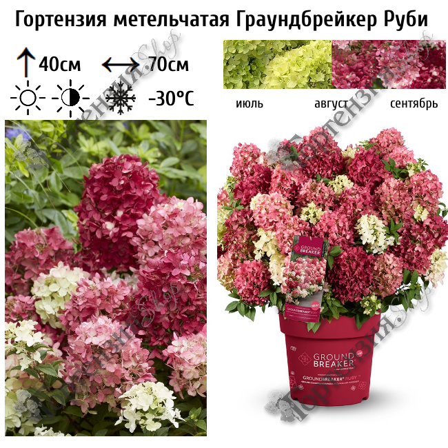 Гортензия Groundbreaker® Ruby™ -это настоящий прорыв в селекции: первая в мире по-настоящему «почвопокровная» серия гортензий, которая растет скорее вширь, чем вверх. Высота кустарника 40 см, ширина до 70 см. Её цветение — это живой градиент. Она начинает сезон с освежающих лаймово-белых соцветий, которые сияют на фоне темно-зеленой листвы. Но самое эффектное шоу начинается ближе к августу: лепестки стремительно наливаются густым рубиновым румянцем, превращая куст в яркое пурпурное облако, которое сохраняет интенсивность цвета до самых заморозков. Отличается обильным 100-дневным цветением (июль-октябрь). Граундбрейкер Руби может использоваться не только как красивый куст, но и как почвопокровное растение, создавая изысканные бордюры.