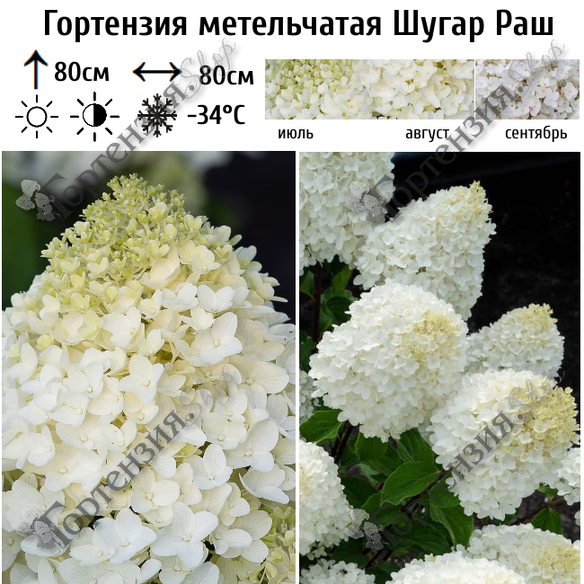 Гортензия метельчатая Шугар Раш (Sugar Rush) - компактная, высотой и шириной до 80 см. Белоснежные цветы сорта гортензии SugarRush плотно собраны в соцветия диаметром около 15 см и по форме напоминают перевёрнутый бокал. К концу летнего сезона белый цвет бутонов может смениться на слегка розоватый.