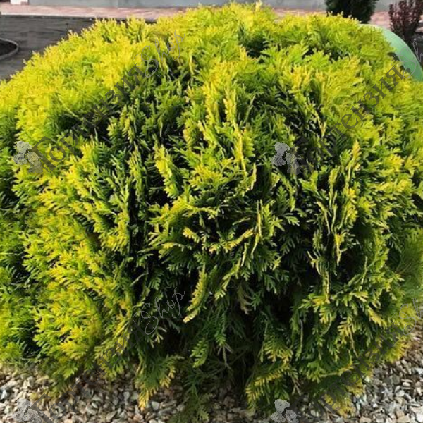Туя западная `Мирьям`- хвойный, шаровидный, медленнорастущий кустарник, высотой до 0,8 м. Хвоя насыщенного, яркого золотисто-зелёного цвета. Вечнозеленый карликовый кустарник с округлой, плотной кроной, тонкими хвоинками и вертикальными веточками. Светолюбива. В тени хвоя тускнеет. Отзывчива на умеренный полив и дождевание по кроне. Прекрасно смотрится в саду круглый год. Используется и как одиночное растение, и в групповых композициях.