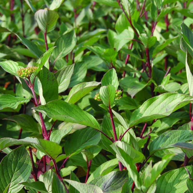 Дерен белый (Cornusalba) Сибирика- декоративный, листопадный кустарник, отличающийся своей необычной окраской. Он неприхотлив и очень хорошо разрастается, достигая двухметровой высоты. Кора ветвей блестящая, красноватого оттенка. Листья эллиптические, заостренные, темно-зеленого цвета. Осенью листья окрашиваются в пурпурный цвет. Цветет обычно в мае-июне, не обильно, шаровидными, кремово-зеленоватыми соцветиями до 4-5 см. в диаметре. Плоды мелкие, круглые, сине-голубые с восковым налетом. Корневая система состоит из множества мелких и тонких корней, именно поэтому куст может быстро высохнуть в условиях жесткой засухи. В остальном дерен белый (Cornusalba) Сибирика одинаково хорошо переносит морозную зиму и жаркое лето. Долговечность кустарника – более 25 лет.