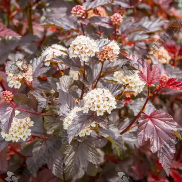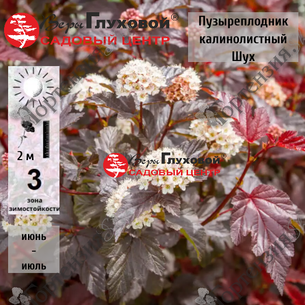 Пузыреплодник калинолистный Шух - высокий сорт с ярко-красными при распускании и темно-бордовыми в дальнейшем листьями. Листопадный кустарник, который достигает 150-200 сантиметров в высоту и 120-150 - в ширину. Ветви раскидистые, куст изящный, имеет округлую форму. Годовой прирост быстрый, зрелости куст достигает к 10 годам. Растение не требовательно к почвам, однако предпочитает плодородные и хорошо увлажненные участки. Пузыреплодник не выносит высоко пролегающих застойных грунтовых вод. Саженец лучше размещать на открытых солнечных участках – чем больше света, тем ярче будет цвет листьев. Возможна посадка в полутени, но листья будут зеленее.