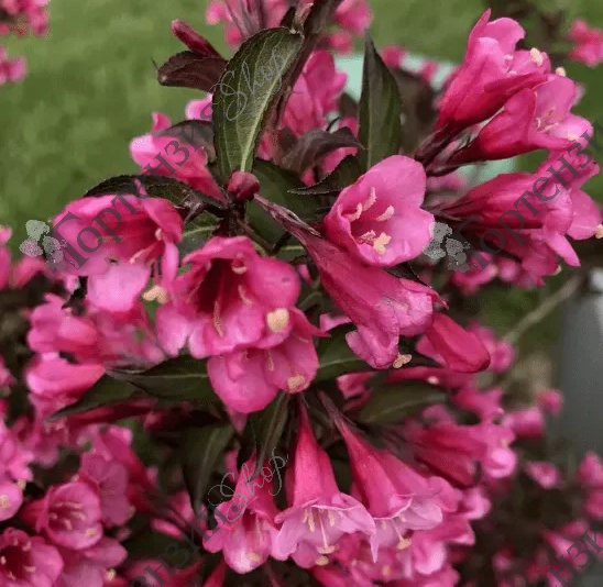 Вейгела цветущая (Weigela florida) Танго - красивоцветущий и одновременно декоративно-лиственный кустарник. Обладает самым необычным и очень привлекательным среди вейгел пурпурным цветом листвы. Во время цветения куст покрывается сначала карминного цвета бутонами, а после вспыхивает малиново-розовыми цветами. Вейгела цветет ярко и обильно. Если после цветения провести обрезку побегов, то во второй половине лета Вейгела порадует Вас повторным ярким цветением, которое может продолжаться до первых заморозков.