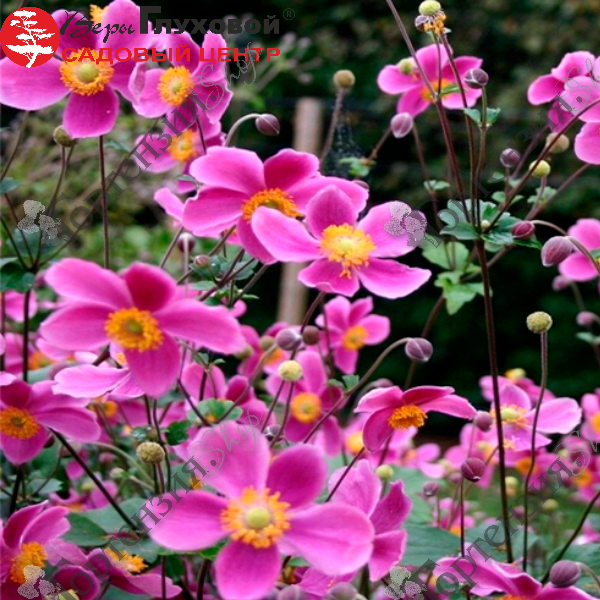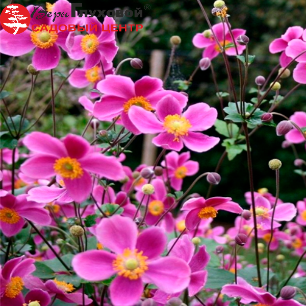 Анемона японская (Anemone hupehensis) 'Прэкокс' - еприхотливое растение высотой до 50 см. Листья собраны в прикорневую розетку. Цветки розовые яркие, простые, с множеством золотистых тычинок, собраны по 10-15 шт. в соцветии. В отличие от многих других садовых многолетнико,в ее длинным и крепким цветоносам не нужна опора. Время цветения - август, сентябрь.