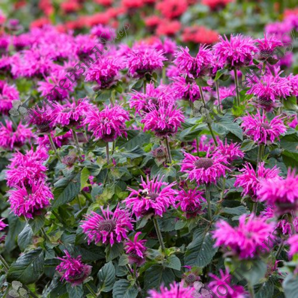 Монарда гибридная 'Би Фри' (Monarda hybrida 'Bee Free') корневищное многолетнее растение. Высота 50 см, листья пальчато-рассечённые, зеленые. Цветки трубчатые, ярко-розовые, почти фиолетовые, собраны в головчатых соцветий диаметром до 6—7 см, располагающихся одно над другим по стеблю, цветут с июня по август. Растение привлекает бабочек и пчел, листья и цветы ароматны. Морозостойкость -34С. Почвы предпочитает дренированные, кислые. Используется в миксбордерах, групповых посадках, в альпийских горках, бордюрной посадке и на срезку. Монарда также ихвестна как Бергамот.