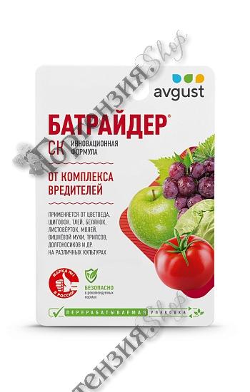 Инновационный универсальный препарат от комплекса вредителей Батрайдер. Защищает от яблонного цветоеда, калифорнийская щитовка, тли, гроздевой листовёртки, тли, вишнёвой мухи, вишнёвого долгоносика. Обладает высокой скоростью воздействия и длительной защитой. Уничтожает 32 вида вредителей. Не имеет аналогов. Применяется на плодовых, ягодных, овощных, цветочных, декоративных культурах и винограде.